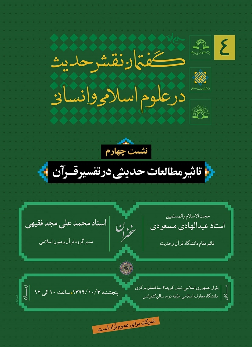 این نشست علمی با سخنرانی حجت الاسلام و المسلمین استاد عبدالهادی مسعودی رئیس پژوهشکده تفسیر اهل بیت علیهم السلام و قائم مقام دانشگاه قرآن و حدیث و استاد محمدعلی مجدفقیهی، مدیر گروه قرآن و متون اسلامی دانشگاه معارف، از سوی پژوهشگاه قرآن و حدیث و با همکاری دانشگاه معارف اسلامی قم و پژوهشکده تفسیر اهل بیت علیهم السلام روز پنج شنبه ۳ دی ماه ۹۴  ساعت ۱۰ الی ۱۲ در سالن جلسات دانشگاه معارف اسلامی برگزار می شود.