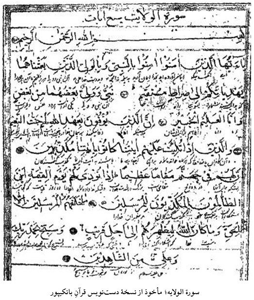 افزوده‌های شیعی که ما اینجا در صدد ترجمه آنها هستیم شامل دو سوره کامل و تعدادی آیات پراکنده است، آیاتی که فرض این بوده که به نحو متناسبی متعلق به سوره‌های مختلفی بوده‌اند که در قرآن آمده‌اند، اما برخی مخالفانِ دعاویِ علی[[ع]] آن آیات را از آن سوره‌ها حذف کرده‌اند. همه این عبارات در نسخه‌ای خطی از قرآن در بانکیپورِ هندوستان در ژوئن ۱۹۱۲ کشف شدند. ما امیدواریم بتوانیم به‌زودی آنها را به شکل اصلیِ عربی، به ضمیمه یادداشت‌ها و ترجمه بین‌خطیِ فارسی‌اش، منتشر سازیم. این نیز قابل ذکر است که این نسخه خطی در کتابخانه‌ای است که یک مسلمان هندی ثروتمند تأسیس کرده است. کتابدار می‌گوید که این نسخه خطی حدود بیست سال پیش