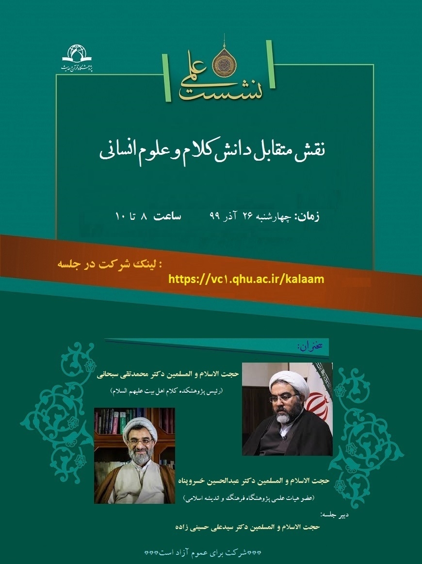 به گزارش روابط عمومی پژوهشگاه قرآن و حدیث، همزمان با هفته پژوهش، نشست علمی "نقش متقابل دانش کلام و علوم انسانی" از سلسله نشست های علمی پژوهشگاه قرآن و حدیث با سخنرانی حجت الاسلام و المسلمین محمدتقی سبحانی، رئیس پژوهشکده کلام اهل بیت علیهم السلام و حجت الاسلام و المسلمین دکتر عبدالحسین خسروپناه، عضو هیات علمی پژوهشگاه فرهنگ و اندیشه اسلامی  و با دبیری حجت الاسلام دکتر سیدعلی حسینی زاده در روز چهارشنبه ۲۶ آذر ماه از ساعت ۸  تا ۱۰ صبح به صورت وبیناری در سالن جلسات موسسه علمی فرهنگی دارالحدیث برگزار می شود.