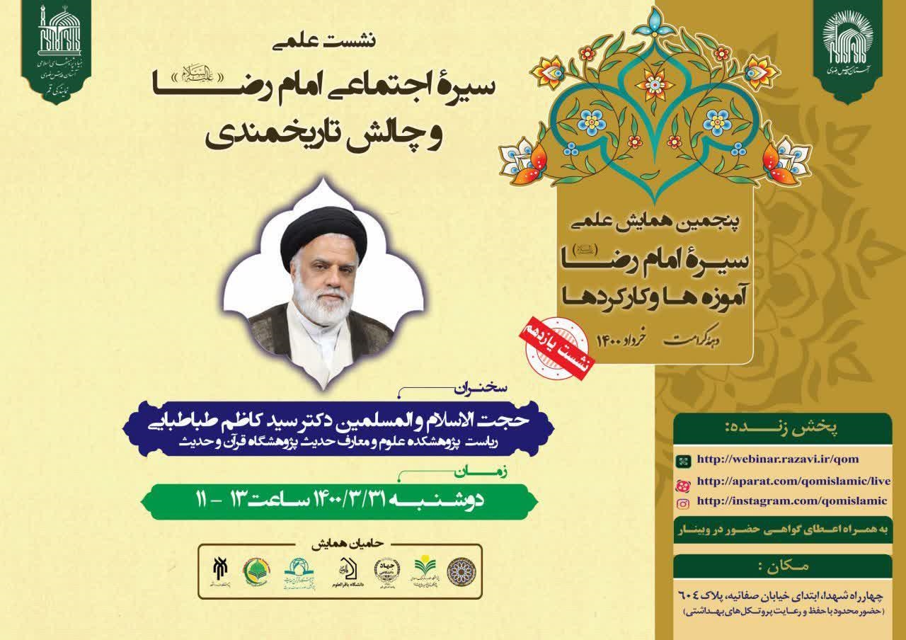به گزارش روابط عمومی پژوهشگاه قرآن و حدیث، همزمان با دهه کرامت، نشست علمی "سیره اجتماعی امام رضا علیه السلام و چالش تاریخمندی" از سلسله نشست های علمی پنجمین همایش علمی سیره امام رضا علیه السلام آموزه ها و کارکردها با همکاری پژوهشگاه قرآن و حدیث و بنیاد پژوهش های اسلامی آستان قدس رضوی، با سخنرانی حجت الاسلام و المسلمین سیدمحمدکاظم طباطبایی، رئیس پژوهشکده علوم و معارف حدیث در روز دوشنبه ۳۱ خرداد ماه از ساعت ۱۱ تا ۱۳ به صورت وبیناری در سالن جلسات نمایندگی بنیاد پژوهش های اسلامی آستان قدس به آدرس، قم، چهار راه شهدا، ابتدای خیابان صفائیه، پلاک ۶۰۴  برگزار می شود.