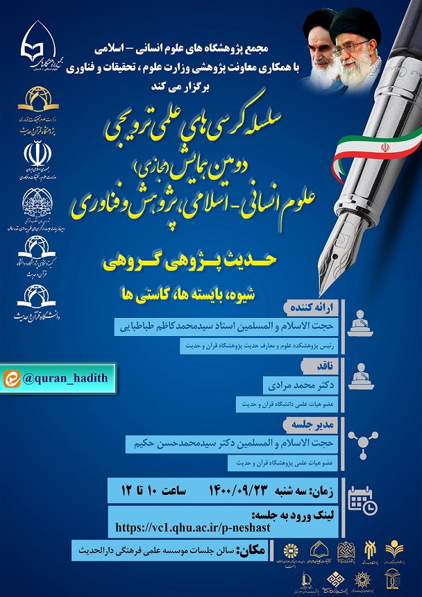 به گزارش روابط عمومی پژوهشگاه قرآن و حدیث، همزمان با هفته پژوهش و در راستای دومین همایش مجازی  علوم انسانی اسلامی، پژوهش و فناوری، کرسی علمی ترویجی "حدیث پژوهی گروهی، شیوه، بایسته­ ها، کاستی­ ها" از سلسله کرسی های علمی ترویجی وبیناری پژوهشگاه قرآن و حدیث با مشارکت معاونت پژوهشی وزارت علوم، تحقیقات و فناوری، مجمع پژوهشگاه های علوم انسانی اسلامی،دبیرخانه هیأت حمایت از کرسی­های نظریه پردازی، نقد و مناظره شورای عالی انقلاب فرهنگی و دانشگاه قرآن و حدیث، با ارائه و سخنرانی حجت الاسلام استاد سیدمحمدکاظم طباطبایی، رئیس پژوهشکده علوم و معارف حدیث پژوهشگاه قرآن و حدیث و آقای  دکتر محمد مرادی، عضو هیات علمی دانشگاه قرآن و حدیث به عنوان ناقد و حجت الاسلام دکتر سیدمحمدحسن حکیم، پژوهشگر پژوهشگاه قرآن و حدیث به عنوان مدیر جلسه در روز سه شنبه ۲۳ آذر ماه از ساعت ۱۰ تا ۱۲ به صورت وبیناری در سالن جلسات موسسه علمی فرهنگی دارالحدیث، برگزار می شود.