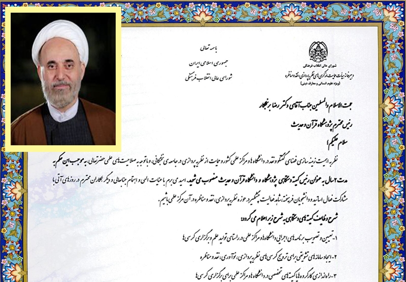 در بخشی از این حکم آمده است؛ « نظر به اهمیت زمینه سازی فضای گفتگو و نقد در دانشگاه ها و مراکز علمی کشور و حمایت از نظریه پردازی در جامعه نخبگانی، و با توجه به صلاحیت های علمی حضرتعالی، به موجب این حکم به مدت ۲ سال به عنوان رئیس کمیته دستگاهی پژوهشگاه و دانشگاه قرآن و حدیث منصوب می شوید. امید می برم با عنایت الهی و اهتمام جنابعالی و دیگر همکاران محترم در روزهای آتی با مشارکت فعال اساتید و دانشجویان فرهیخته، شاهد فعالیت چشمگیر در حوزه نظریه پردازی، نقد و مناظره در آن مرکز علمی باشیم.».