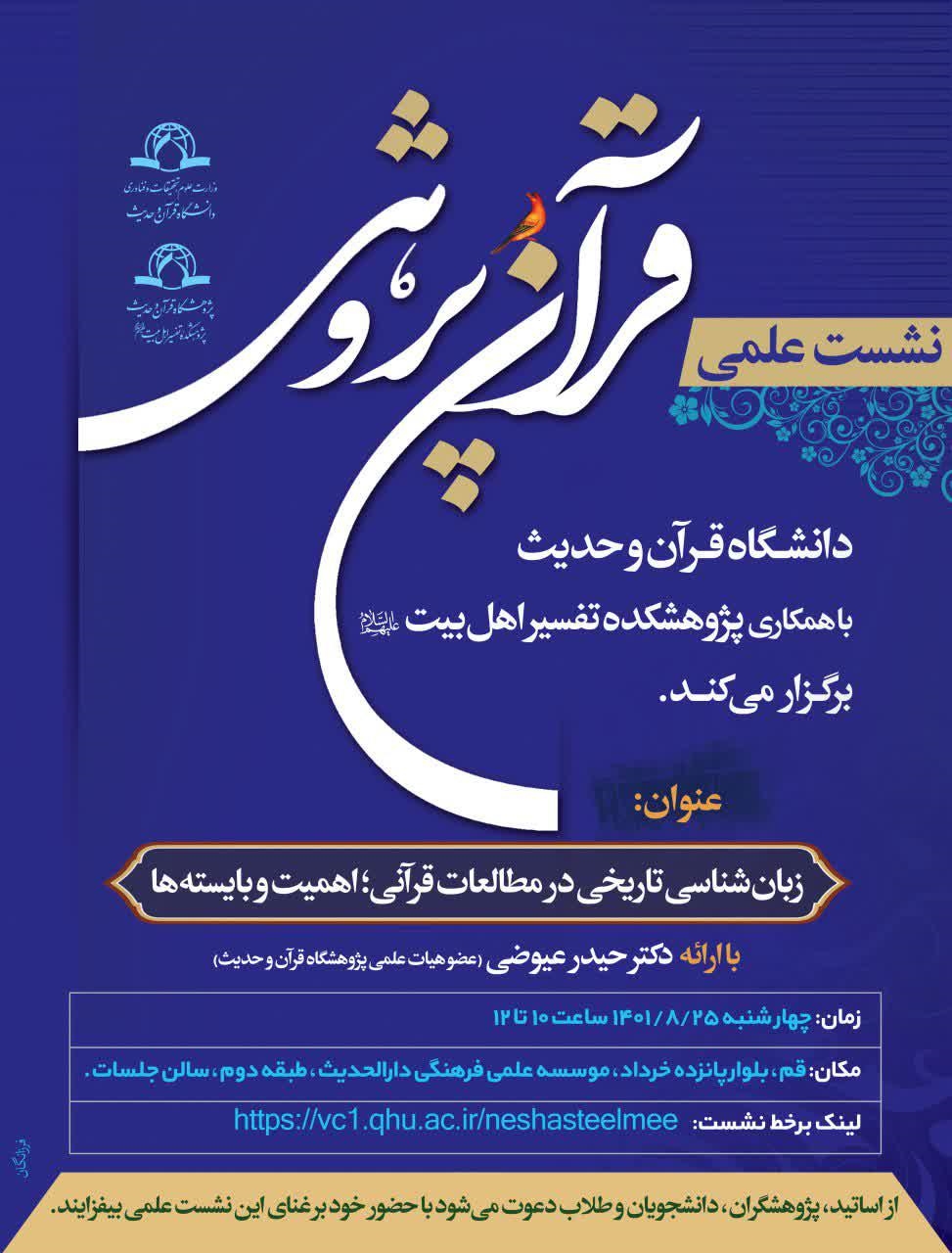 به گزارش روابط عمومی پژوهشگاه قرآن و حدیث، نشست علمی "زبان شناسی تاریخی در مطالعات قرآنی؛اهمیت و بایسته ها" با همکاری پژوهشگاه قرآن و حدیث و دانشگاه قرآن و حدیث با سخنرانی دکتر حیدر عیوضی، عضو هیات علمی پژوهشگاه قرآن و حدیث در روز چهارشنبه ۲۵ آبان ماه از ساعت ۱۰ تا ۱۲ به صورت حضوری و وبیناری در سالن جلسات موسسه علمی فرهنگی دارالحدیث، برگزار می شود.