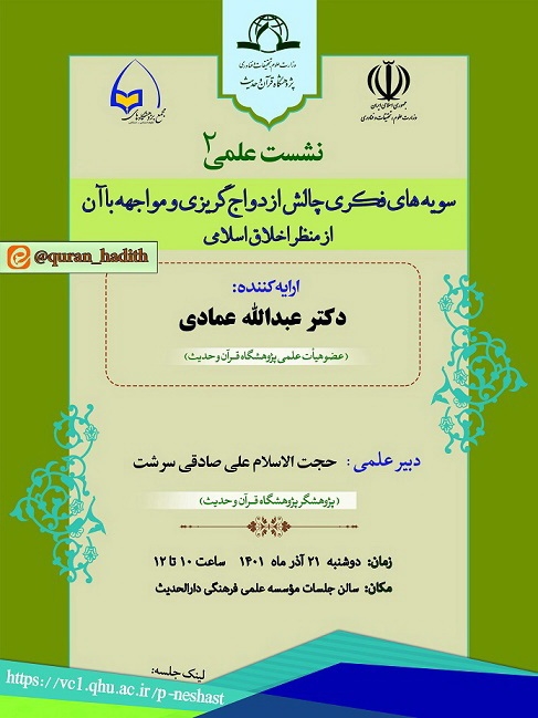 به گزارش روابط عمومی پژوهشگاه قرآن و حدیث، همزمان با هفته پژوهش و در راستای سومین همایش علوم انسانی اسلامی، پژوهش و فناوری، نشست علمی "سویه­ های فکری چالش ازدواج گریزی و مواجهه با آن از منظر اخلاق اسلامی" از سلسله نشست های علمی پژوهشگاه قرآن و حدیث با مشارکت معاونت پژوهشی وزارت علوم، تحقیقات و فناوری ومجمع پژوهشگاه های علوم انسانی اسلامی با سخنرانی دكتر عبدالله عمادي، عضو هیات علمی پژوهشگاه قرآن و حدیث و با دبیری حجت الاسلام دكتر علی صادقی سرشت،  پژوهشگر پژوهشگاه قرآن و حدیث در روز دوشنبه ۲۱ آذر ماه از ساعت ۱۰ تا ۱۲ به صورت حضوری و وبیناری در سالن جلسات موسسه علمی فرهنگی دارالحدیث، برگزار می شود.