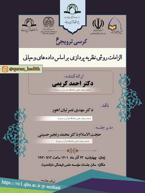 به گزارش روابط عمومی پژوهشگاه قرآن و حدیث، همزمان با هفته پژوهش و در راستای سومین همایش علوم انسانی – اسلامی، پژوهش و فناوری، کرسی علمی ترویجی "الزامات روشی نظریه پردازی بر اساس داده های وحیانی" از سلسله کرسی های ترویجی دانشگاه و پژوهشگاه قرآن و حدیث و با مشارکت معاونت پژوهشی وزارت علوم، تحقیقات و فناوری و مجمع پژوهشگاه های علوم انسانی – اسلامی و دبیرخانه هیات حمایت از کرسی های نظریه پردازی، نقد و مناظره شورای عالی انقلاب فرهنگی، با ارائه و سخنرانی دکتر احمد کریمی، عضو هیات علمی دانشگاه قرآن و حدیث و با حضور دکتر مهدی نصرتیان اهور، عضو هیات علمی دانشگاه قرآن و حدیث به عنوان ناقد و حجت الاسلام دکتر محمد رنجبر حسینی، عضو هیات علمی دانشگاه قرآن و حدیث به عنوان مدیر جلسه، در روز چهارشنبه ۲۳ آذر ماه ۱۴۰۱ از ساعت ۱۳ تا ۱۴:۳۰ به صورت حضوری و وبیناری در سالن جلسات موسسه علمی فرهنگی دارالحدیث برگزار می شود.