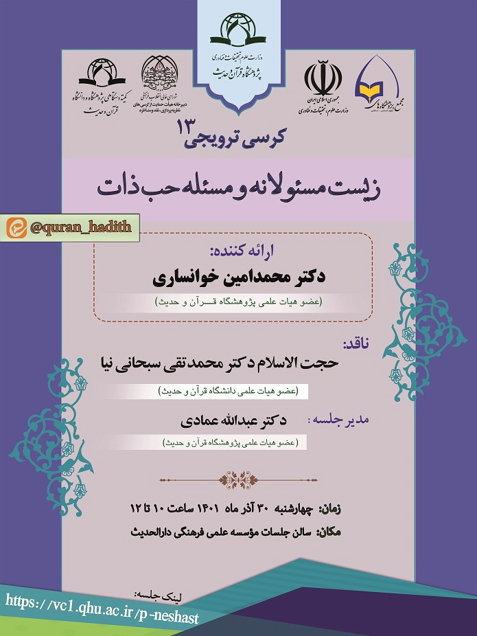 به گزارش روابط عمومی پژوهشگاه قرآن و حدیث، همزمان با هفته پژوهش و در راستای سومین همایش علوم انسانی اسلامی، پژوهش و فناوری، کرسی علمی ترویجی "زیست مسئولانه و مسئله حب ذات" از سلسله کرسی های ترویجی پژوهشگاه قرآن و حدیث و با مشارکت معاونت پژوهشی وزارت علوم، تحقیقات و فناوری و مجمع پژوهشگاه های علوم انسانی اسلامی و دبیرخانه هیات حمایت از کرسی های نظریه پردازی، نقد و مناظره شورای عالی انقلاب فرهنگی، با ارائه و سخنرانی دکتر محمدامین خوانساری، عضو هیات علمی پژوهشگاه قرآن و حدیث و با حضور حجت الاسلام دکتر محمدتقی سبحانی نیا، عضو هیات علمی دانشگاه قرآن و حدیث به عنوان ناقد و دكتر عبدالله عمادي، عضو هیات علمی پژوهشگاه قرآن و حدیث به عنوان مدیر جلسه، در روز چهارشنبه ۳۰ آذر ماه ۱۴۰۱ از ساعت ۱۰ تا ۱۲به صورت حضوری و وبیناری در سالن جلسات موسسه علمی فرهنگی دارالحدیث برگزار می شود.