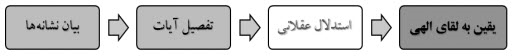 حادثه نهایی در آیه بالا یقین به لقای خداوند است. پدیده پیش از آن تفصیل آیات و پیش از آن تدبیر امور از سوی خداوند است. اینها نشانههاییاند که در جهان رخ میدهند و به منظور تأمل عقلانی بیان شدهاند. در رایجترین حالت در میان مراحل زنجیره علّی، پنجره توجه به مرحله اول و مرحله نهایی باز میشود. در زنجیره علّی پس از عامل و معلول مهمترین مرحله، مرحله پیش از مرحله نهایی است که علت مباشری معلول به شمار میرود. در آیه دوم سوره رعد هردو مرحله اول و پیش از نهایی با تأمل و استدلال عقلانی مرتبطاند و در تحقق معلول نهایی نیز ارتباط مستقیم دارند. نخستین هدفِ بیان نشانهها، تأمل و استدلال عقلانی است. تفصیل آیات دقیقاً همین هدف را پیگیری میکند. حال چرا این هدف - استدلال عقلی - در آیه بیان نشده است؟ علت آن را میتوان در باز شدن پنجره توجه به هدف نهایی، یعنی یقین، دانست: «میتوانیم به طور کلی بگوییم که قرآن یک دستگاه توجه است. بدین معنا که در بخشها و بافتهای گوناگون بخش خاصی از یک مسیر یا فرآیند در کانون توجه قرار میگیرد».۱