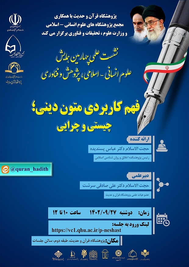 به گزارش روابط عمومی پژوهشگاه قرآن و حدیث، همزمان با هفته پژوهش ۱۴۰۲ در راستای چهارمین همایش علوم انسانی اسلامی، پژوهش و فناوری، دوازدهمین نشست از سلسله نشست های علمی پژوهشگاه با عنوان "فهم کاربردی متون دینی؛ چیستی و چرایی"با حضور و سخنرانی حجت الاسلام دکتر عباس پسندیده، رئیس پژوهشکده اخلاق و روان شناسی اسلامی و با دبیری حجت الاسلام دکتر علی صادقی سرشت، عضو هیأت علمی پژوهشگاه قرآن و حدیث، با مشارکت و همکاری مجمع پژوهشگاه های علوم انسانی - اسلامی و وزارت علوم، تحقیقات و فناوری، در روز دوشنبه ۲۷ آذر ماه ۱۴۰۲ از ساعت ۱۰ تا ۱۲ به صورت حضوری و وبیناری در سالن جلسات پژوهشگاه قرآن و حدیث برگزار می شود.