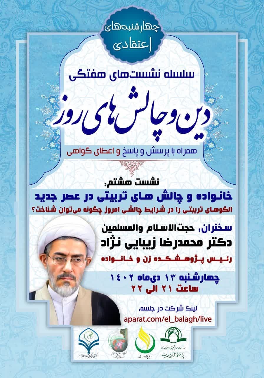 به گزارش روابط عمومی پژوهشگاه قرآن و حدیث، نشست علمی "خانواده و چالش های تربیتی در عصر جدید" با طرح سؤال: "الگوهای تربیتی را در شرایط چالشی امروز چگونه می توان شناخت؟"از هشتمین نشست از سلسله جلسات و نشست های "دین و چالش های روز" ویژه "چهارشنبه های اعتقادی" از سوی پژوهشگاه قرآن و حدیث، انجمن کلام اسلامی حوزه، کمیته مرکزی کرسی های آزاداندیشی حوزه های علمیه و مرکز آموزش های کاربردی دفتر تبلیغات اسلامی قم با ارائه و سخنرانی حجت الاسلام دکتر محمدرضا زیبایی نژاد، رئیس پژوهشکده زن و خانواده در روز چهارشنبه ۱۳ دی ماه ۱۴۰۲ از ساعت ۲۱ تا ۲۲ به صورت وبیناری برگزار می شود.
