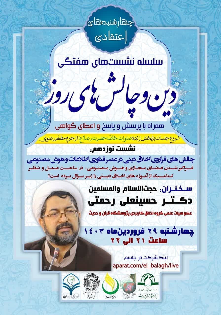 به گزارش روابط عمومی پژوهشگاه قرآن و حدیث، نشست علمی"چالش های فراروی اخلاق دینی در عصر فناوری اطلاعات و هوش مصنوعی" با طرح پرسش "فراگیر شدن فضای مجازی و هوش مصنوعی در ساحت عمل و نظر، کدامیک از آموزه های اخلاق دینی را زیر سؤال برده است؟" از نوزدهمین نشست از سلسله جلسات و نشست های "دین و چالش های روز" ویژه "چهارشنبه های اعتقادی" از سوی پژوهشگاه قرآن و حدیث، انجمن کلام اسلامی حوزه، کمیته مرکزی کرسی های آزاداندیشی حوزه های علمیه و مرکز آموزش های کاربردی دفتر تبلیغات اسلامی قم با ارائه و سخنرانی حجت الاسلام دکتر حسینعلی رحمتی عضو هیات علمی پژوهشگاه قرآن و حدیث در روز چهارشنبه ۲۹ فروردین ماه ۱۴۰۳ از ساعت ۲۱ تا ۲۲ به صورت وبیناری برگزار می شود.