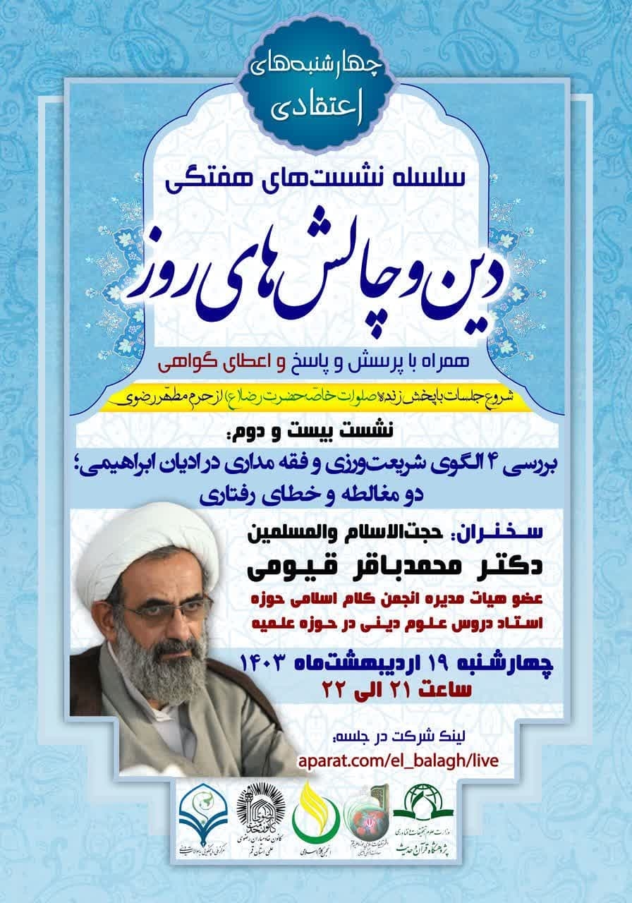 به گزارش روابط عمومی پژوهشگاه قرآن و حدیث، نشست علمی"بررسی چهار الگوی شریعت ورزی و فقه مداری در ادیان ابراهیمی؛ دو مغالطه و خطای رفتاری" از بیست و دومین نشست از سلسله جلسات و نشست های "دین و چالش های روز"  ویژه "چهارشنبه های اعتقادی" از سوی پژوهشگاه قرآن و حدیث، انجمن کلام اسلامی حوزه، کمیته مرکزی کرسی های آزاداندیشی حوزه های علمیه و مرکز آموزش های کاربردی دفتر تبلیغات اسلامی قم با ارائه و سخنرانی حجت الاسلام دکتر محمدباقر قیومی، عضو هیات مدیره انجمن کلام اسلامی حوزه و استاد دروس علوم دینی در حوزه علمیه در روز چهارشنبه ۱۹اردیبهشت ماه ۱۴۰۳  از ساعت ۲۱ تا ۲۲ به صورت وبیناری برگزار می شود.