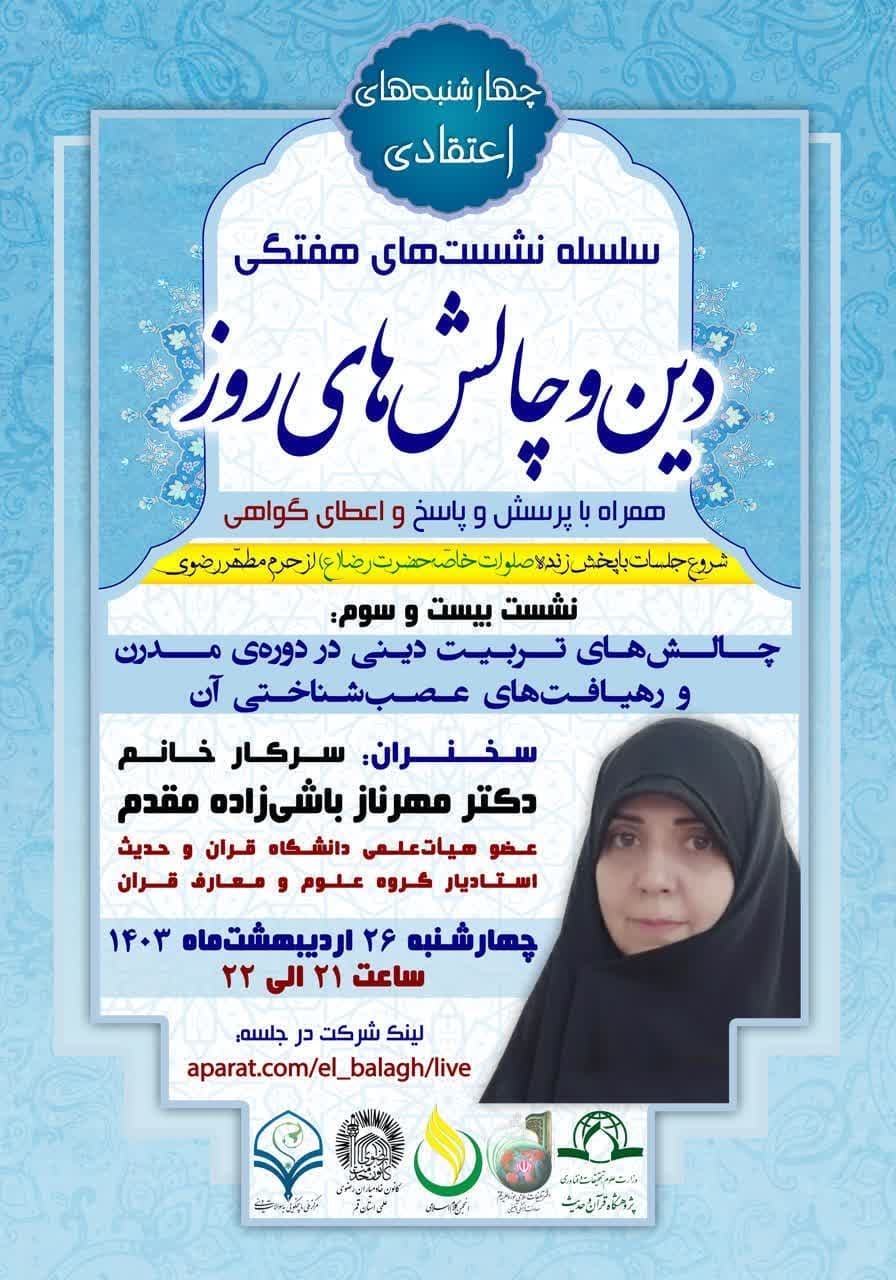 به گزارش روابط عمومی پژوهشگاه قرآن و حدیث، نشست علمی"چالش‌های تربیت دینی در دوره مدرن و رهیافت‌های عصب‌شناختی آن" از بیست و سومین نشست از سلسله جلسات و نشست های "دین و چالش های روز"  ویژه "چهارشنبه های اعتقادی"از سوی پژوهشگاه قرآن و حدیث، انجمن کلام اسلامی حوزه، کمیته مرکزی کرسی های آزاداندیشی حوزه های علمیه و مرکز آموزش های کاربردی دفتر تبلیغات اسلامی قم با ارائه و سخنرانی  سرکار خانم دکتر مهرناز باشی‌زاده مقدم، عضو هیأت علمی  دانشگاه قرآن و حدیث، استادیار گروه علوم و معارف قرآن، پژوهشگر حوزه‌ علوم شناختی دین در روز چهارشنبه ۲۶ اردیبهشت ماه ۱۴۰۳  از ساعت ۲۱ تا ۲۲ به صورت وبیناری برگزار می شود.