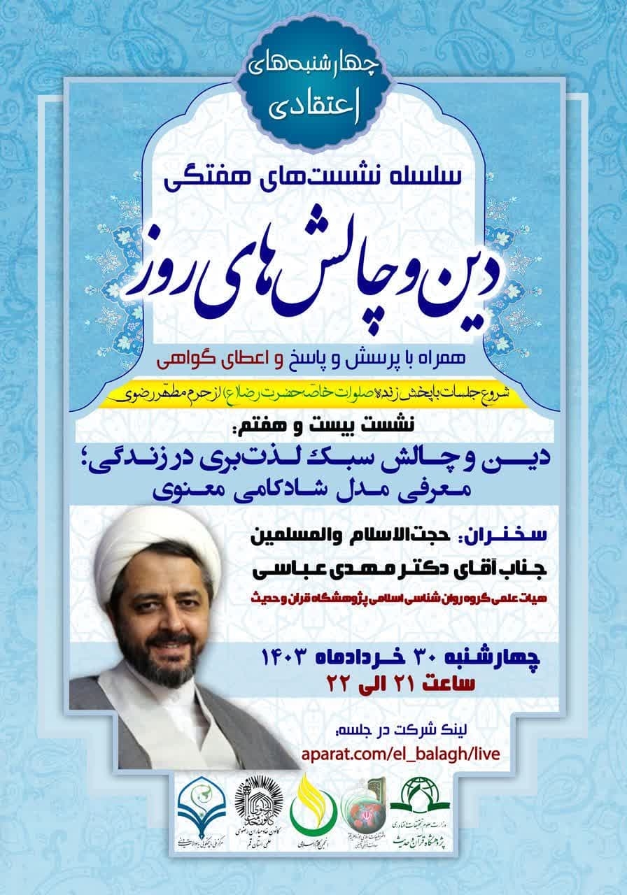 به گزارش روابط عمومی پژوهشگاه قرآن و حدیث، نشست علمی "دین و چالش سبک لذت بری در زندگی؛ معرفی مدل شادکامی معنوی"از بیست و هفتمین نشست از سلسله جلسات و نشست های "دین و چالش های روز" ویژه "چهارشنبه های اعتقادی"از سوی پژوهشگاه قرآن و حدیث، انجمن کلام اسلامی حوزه، کمیته مرکزی کرسی های آزاداندیشی حوزه های علمیه و مرکز آموزش های کاربردی دفتر تبلیغات اسلامی قم با ارائه و سخنرانی حجت الاسلام و المسلمین دکتر مهدی عباسی، عضو هیات علمی پژوهشگاه قرآن و حدیث در روز چهارشنبه ۳۰ خرداد ماه ۱۴۰۳ از ساعت ۲۱ تا ۲۲ به صورت وبیناری برگزار می شود.