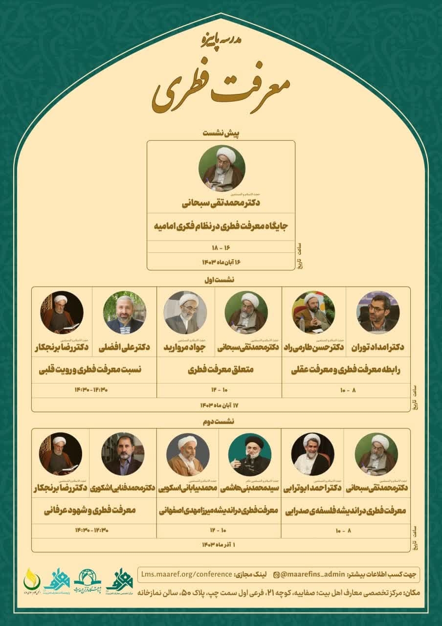 به گزارش روابط عمومی پژوهشگاه قرآن و حدیث، ویژه برنامه "مدرسه پاییزه معرفت فطری"در قالب یک پیش نشست علمی با موضوع " جایگاه معرفت فطری در نظام فکری امامیه" و نیز دو نشست علمی با موضوعاتی همچون "رابطه معرفت فطری و معرفت عقلی"، "متعلق معرفت فطری"، "نسبت معرفت فطری و رؤیت قلبی"، "معرفت فطری در اندیشه فلسفهی صدرایی"، "معرفت فطری در اندیشه میرزامهدی اصفهانی"، "معرفت فطری و شهود عرفانی" با حضور اساتید حجج اسلام؛ دکتر رضا برنجکار، دکتر محمدتقی سبحانی، دکتر حسن طارمی راد، جواد مروارید، سیدمحمد بنی هاشمی محمد بیابانی اسکویی و آقایان دکتر علی افضلی، دکتر امداد توران، دکتر احمد ابوترابی و دکتر محمد فنایی اشکوری با همکاری و مشارکت پژوهشگاه قرآن و حدیث، مرکز تخصصی معارف اهل بیت علیهم السلام، انجمن کلام اسلامی حوزه و پژوهشکده معارف اهل بیت علیهم السلام در روزهای چهارشنبه ۱۶ آبان و پنجشنبه ۱۷ آبان و پنجشنبه ۱ آذر ماه ۱۴۰۳ از ساعت ۸ تا ۱۴:۳۰ در مرکز تخصصی معارف اهل بیت علیهم السلام به صورت حضوری و وبیناری برگزار می شود.