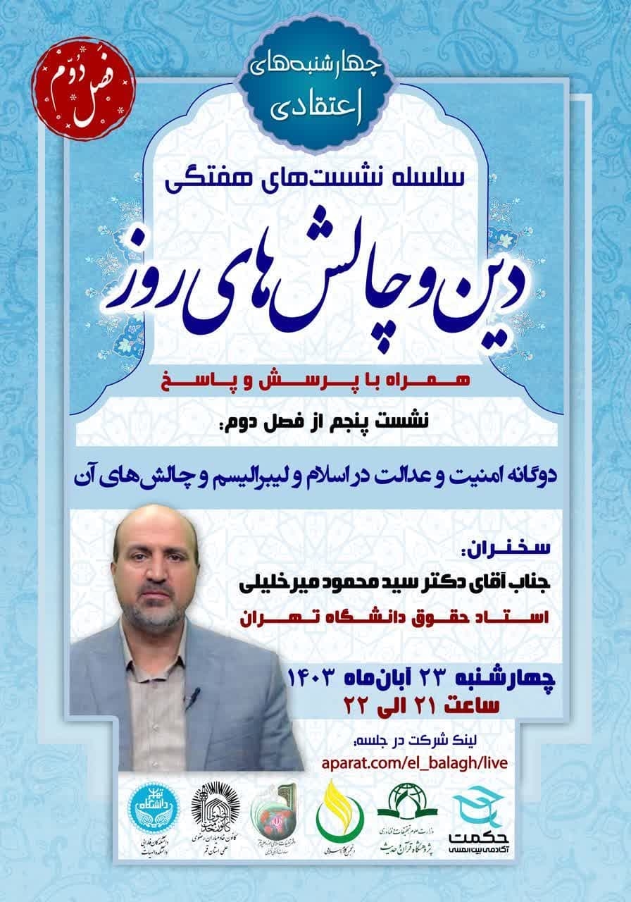 به گزارش روابط عمومی پژوهشگاه قرآن و حدیث، نشست علمی "دوگانه امنیت و عدالت در اسلام و لیبرالیسم و چالش های آن"پنجمین نشست از سلسله جلسات و نشست های"دین و چالش های روز" ویژه "چهارشنبه های اعتقادی" از فصل دوم از سوی پژوهشگاه قرآن و حدیث، انجمن کلام اسلامی حوزه، مرکز آموزش های کاربردی دفتر تبلیغات اسلامی قم، مرکز ملی پاسخگویی به سوالات دینی، کانون خادمیاران رضوی استان قم و موسسه حکمت با ارائه و سخنرانی دکتر سیدمحمود میرخلیلی، استاد حقوق دانشگاه تهران در روز چهارشنبه ۲۳ آبان ماه ۱۴۰۳ از ساعت ۲۱ تا ۲۲ به صورت وبیناری برگزار می شود.