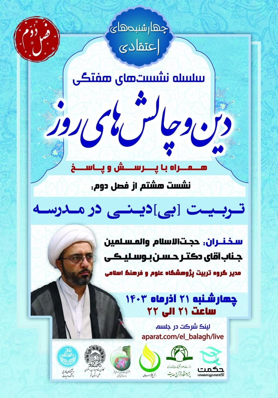 به گزارش روابط عمومی پژوهشگاه قرآن و حدیث، نشست علمی "تربیت [بی] دینی در مدرسه"هشتمین نشست از سلسله جلسات و نشست های"دین و چالش های روز" ویژه "چهارشنبه های اعتقادی" از فصل دوم از سوی پژوهشگاه قرآن و حدیث، انجمن کلام اسلامی حوزه، مرکز آموزش های کاربردی دفتر تبلیغات اسلامی قم، مرکز ملی پاسخگویی به سوالات دینی، کانون خادمیاران رضوی استان قم و موسسه حکمت با ارائه و سخنرانی حجت الاسلام و المسلمین دکتر حسن بوسلیکی؛ مدیر گروه تربیت پژوهشگاه علوم و فرهنگ اسلامی در روز چهارشنبه ۲۱ آذر ماه ۱۴۰۳ از ساعت ۲۱ تا ۲۲ به صورت وبیناری برگزار می شود.
