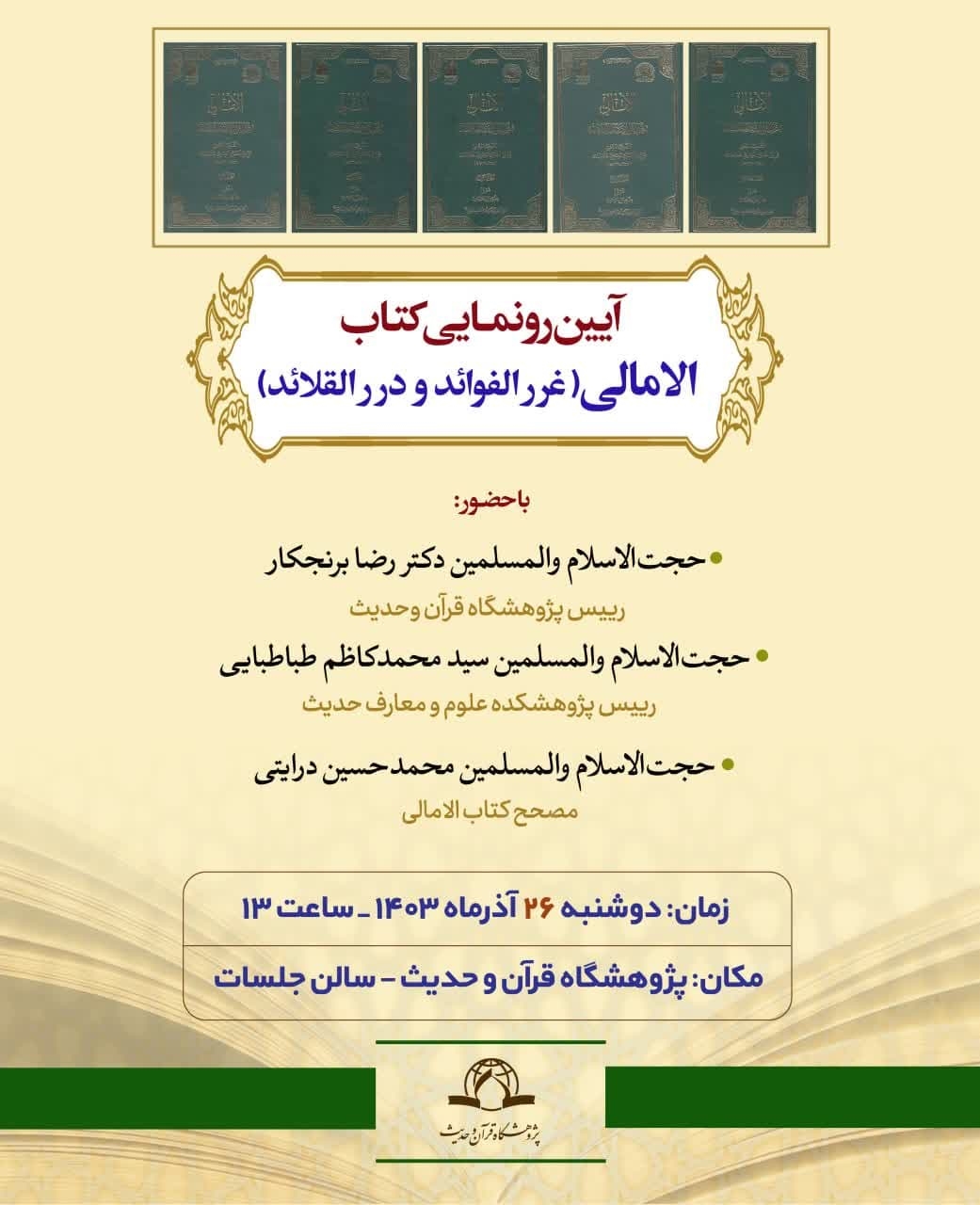 آیین رونمایی از کتاب "الامالی (غرر الفوائد و درر القلائد)؛ سیدمرتضی" از سوی پژوهشگاه قرآن و حدیث برگزار می شود.